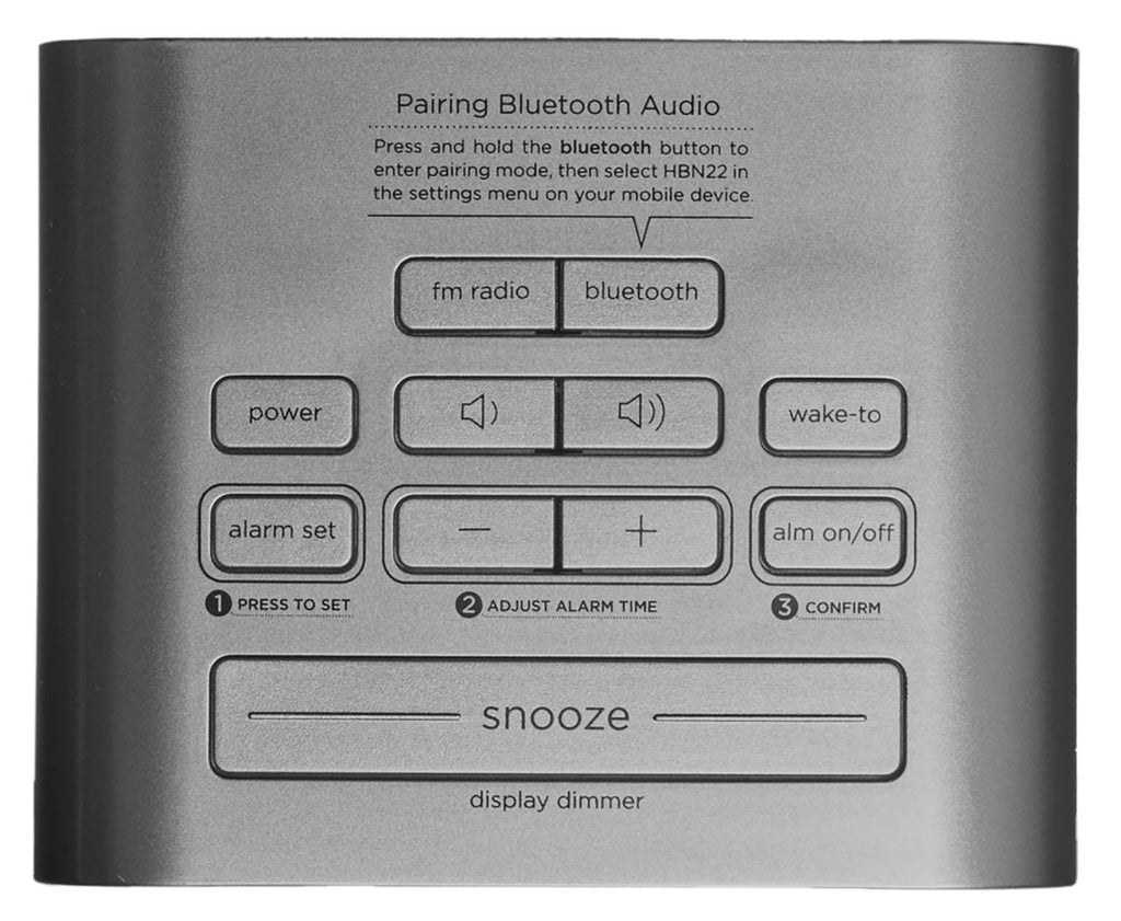 - Wake to Bluetooth audio, FM radio or 4 alarm tones
